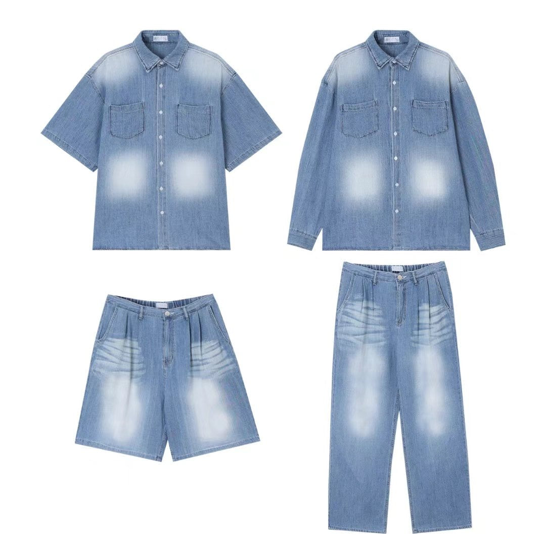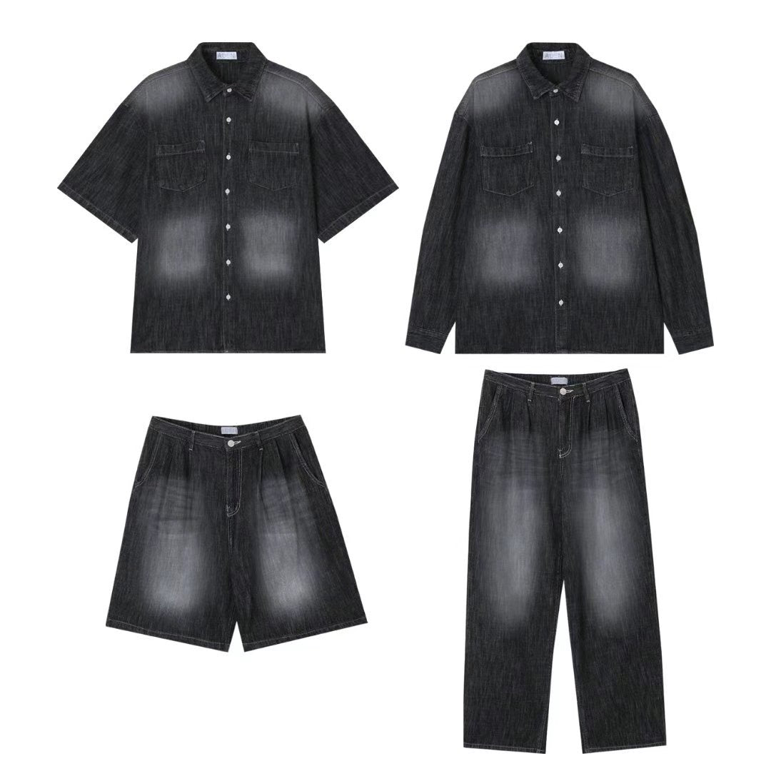 工業風復古牛仔長袖+短褲套裝