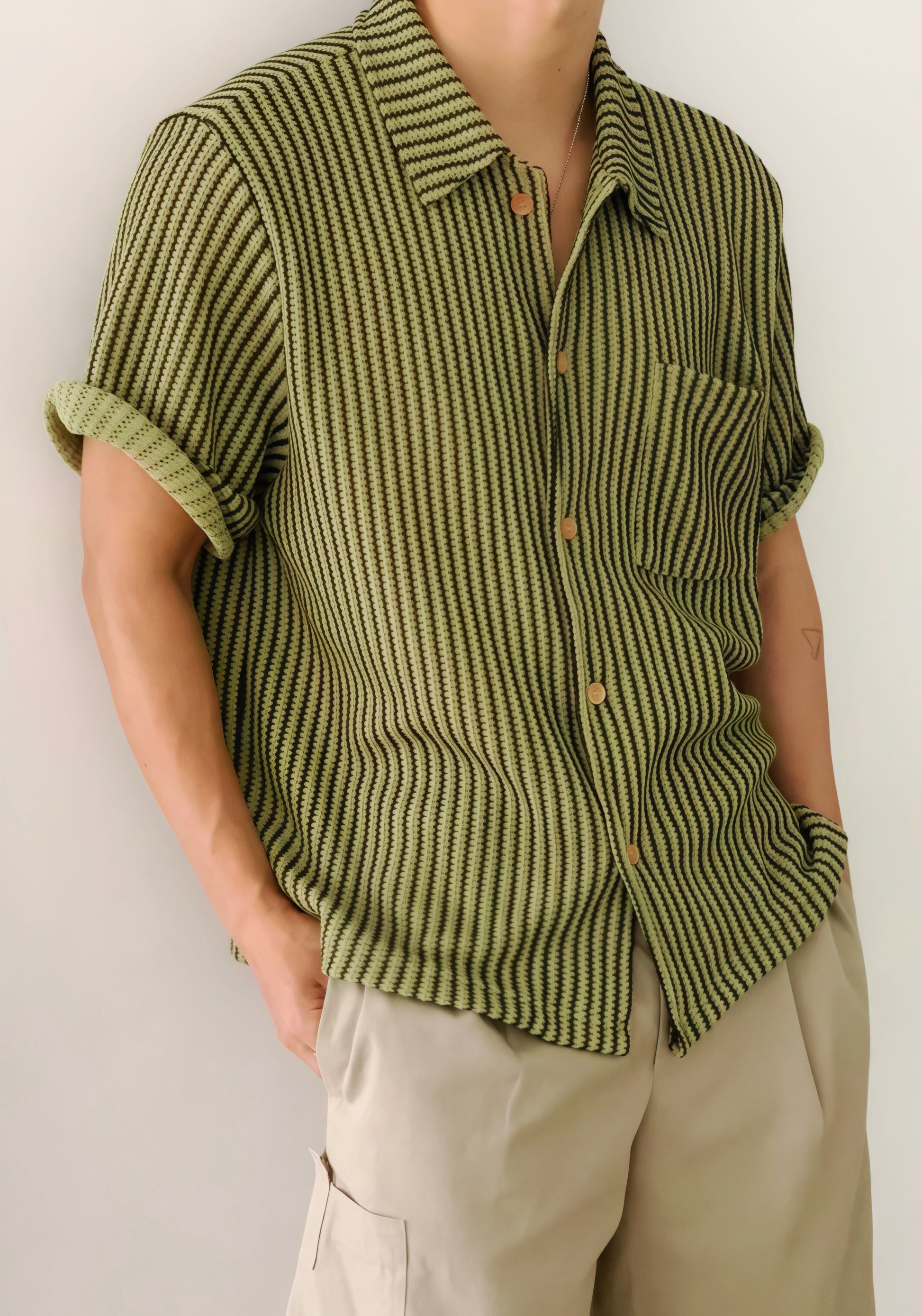 布料挺身唔侷促,唔貼身但有形,袖口自然垂感加上自製的微捲效果,俾人一種自由放鬆嘅感覺。襯短褲、直腳褲、甚至牛仔褲都無壓力,Chill住出街嘆咖啡完全冇難度。