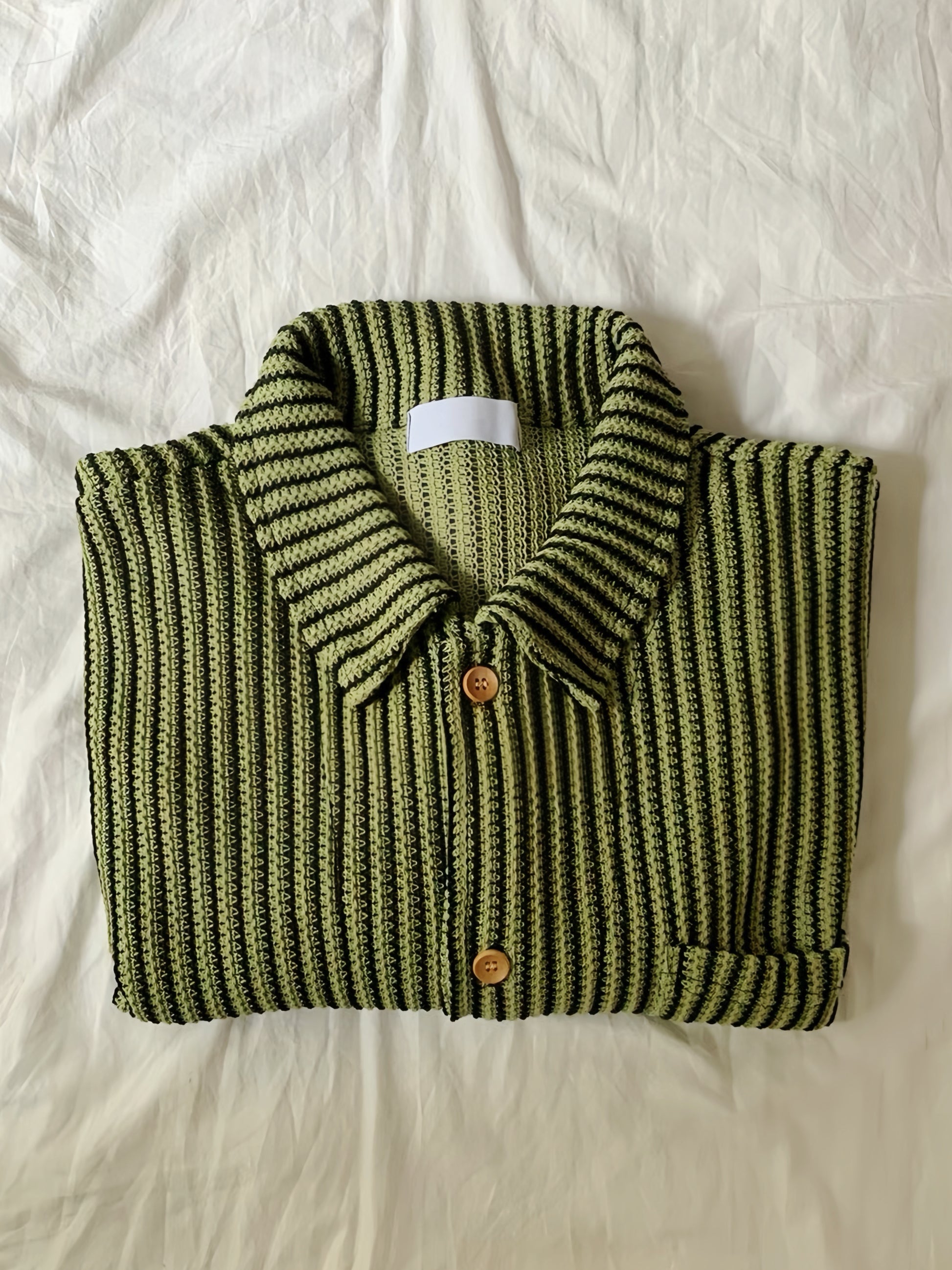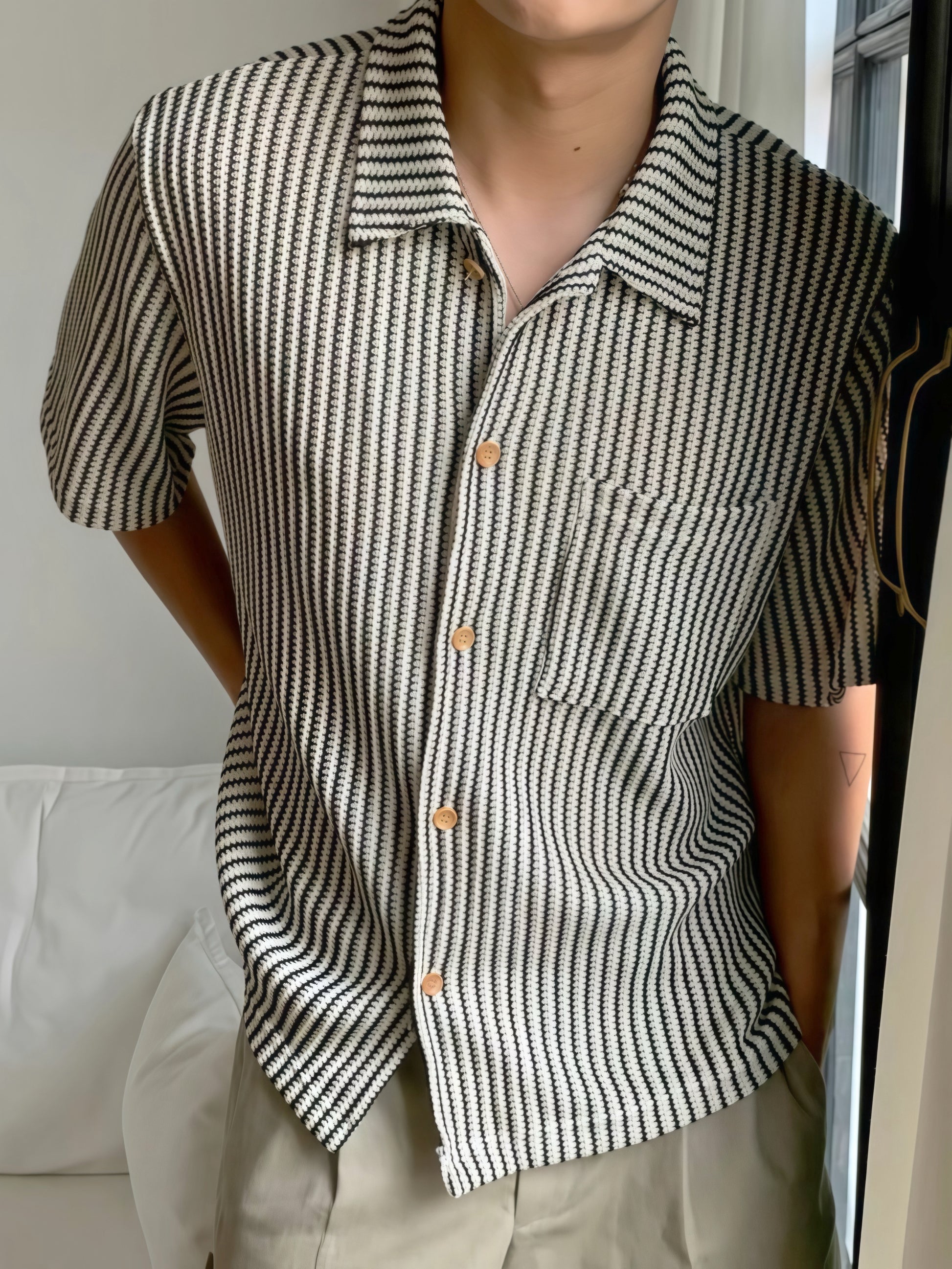 呢件襯衫用上立體感編紋設計,配上開領剪裁,一著就帶出慵懶又俐落嘅男友感。條紋排列自然唔浮誇,配色低調得嚟夠個性,無論係單穿定開鈕做外搭,都有復古氣質。