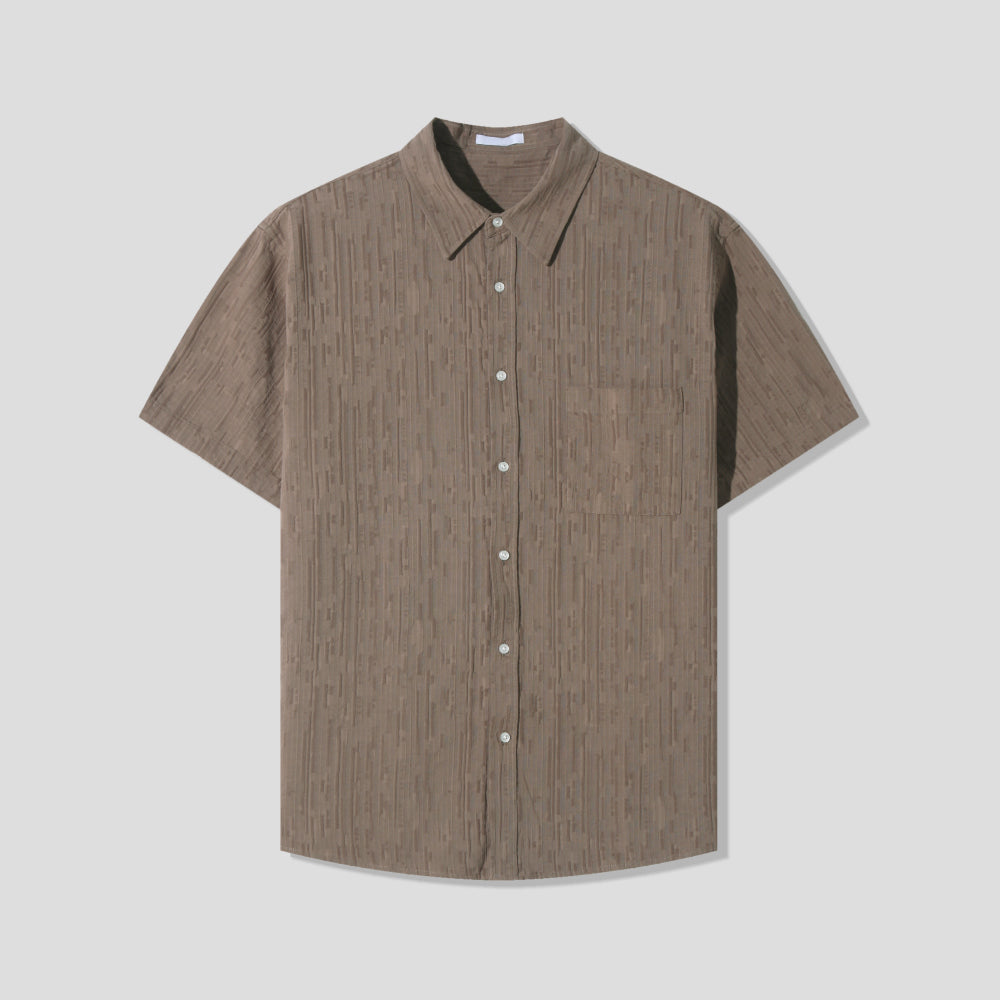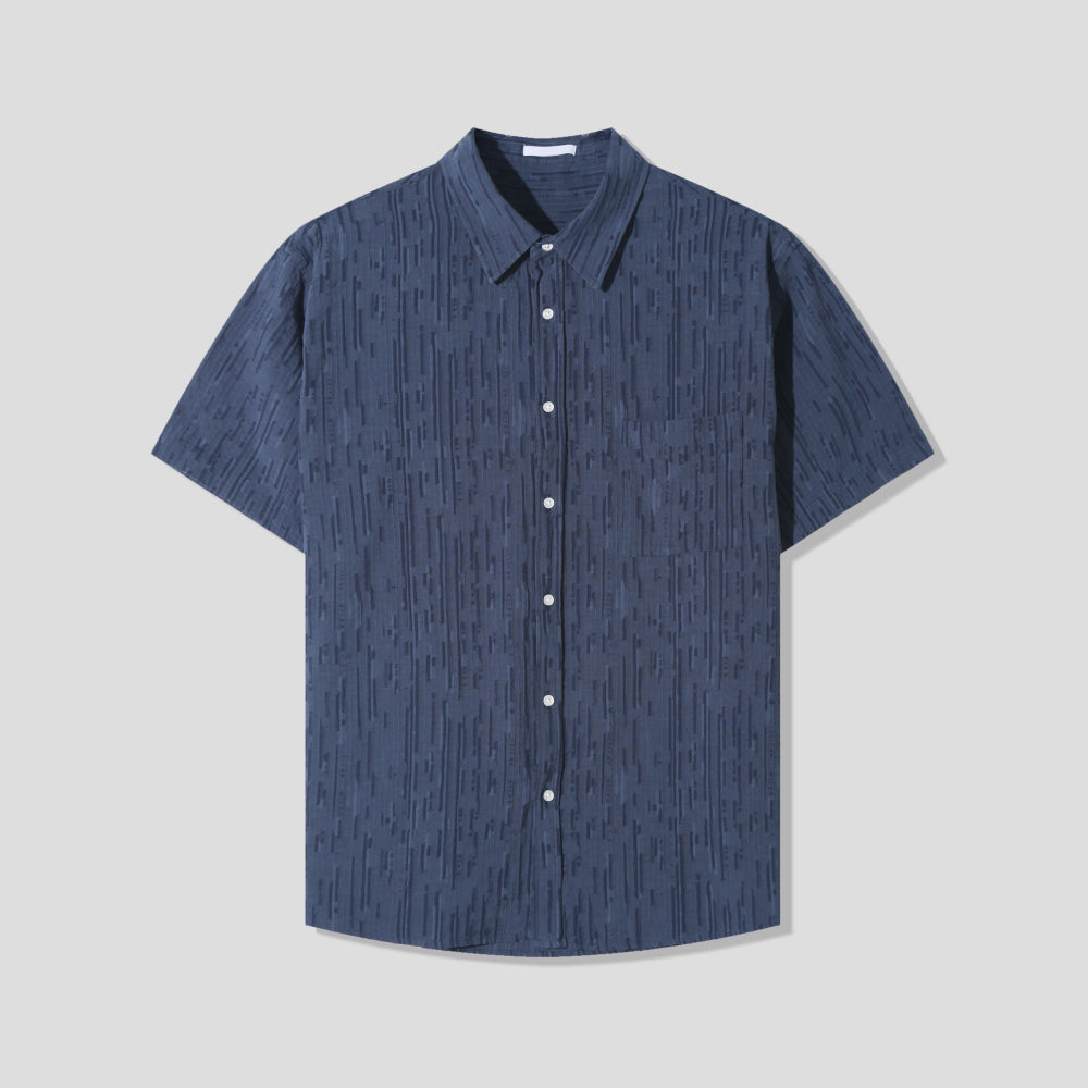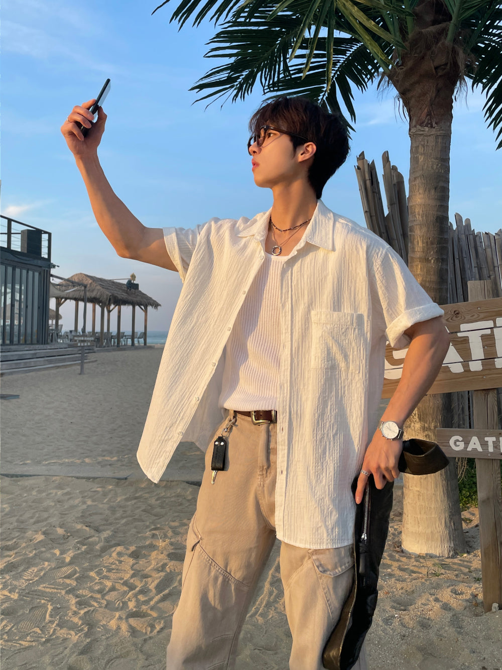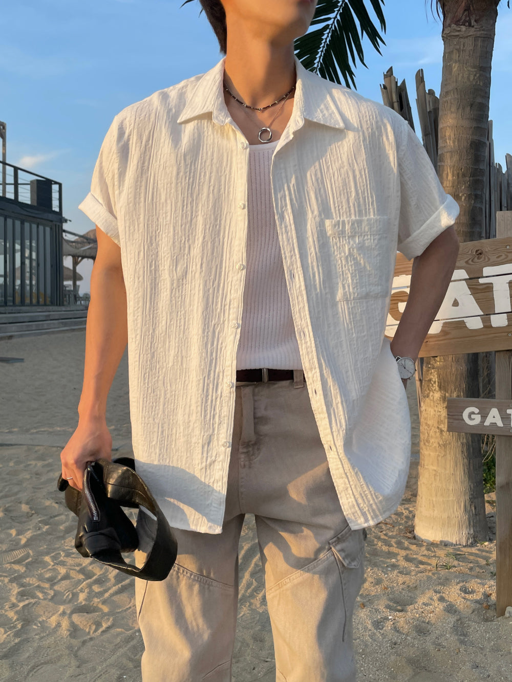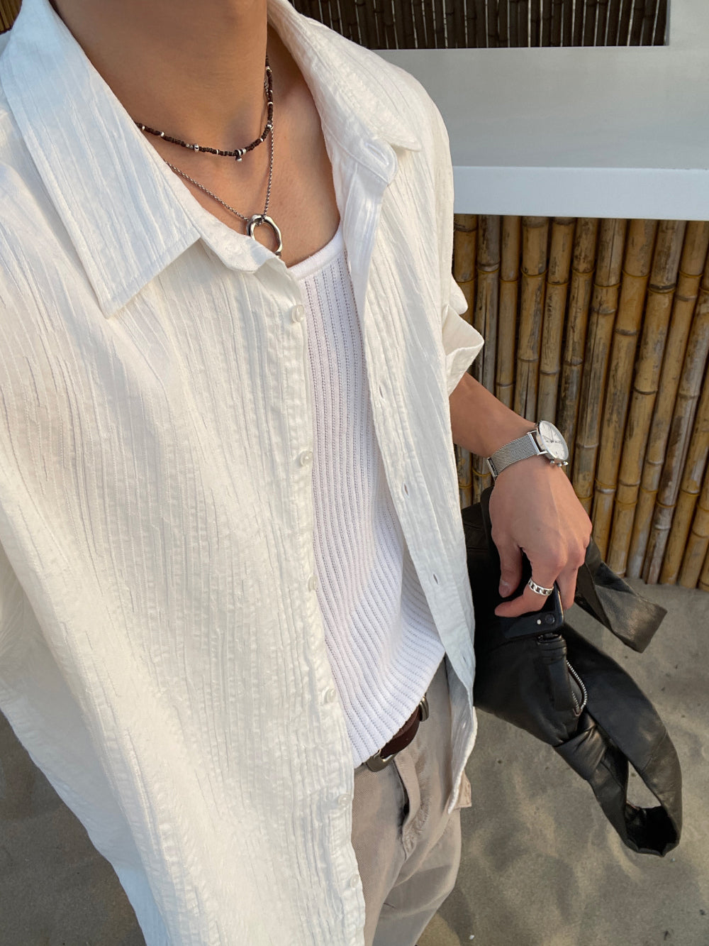 布料帶細緻壓紋,喺自然光底下隱隱泛光,舒服得嚟有層次感。開領設計配合輕身質地,無論單穿定襯背心都透氣涼爽,啱晒放假、傍晚出街、或者嗰啲「想見人但又唔想扮嘢」嘅時候。