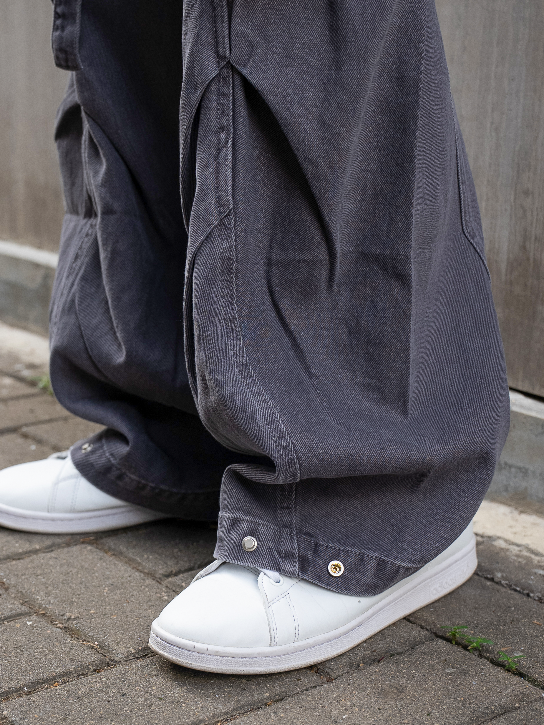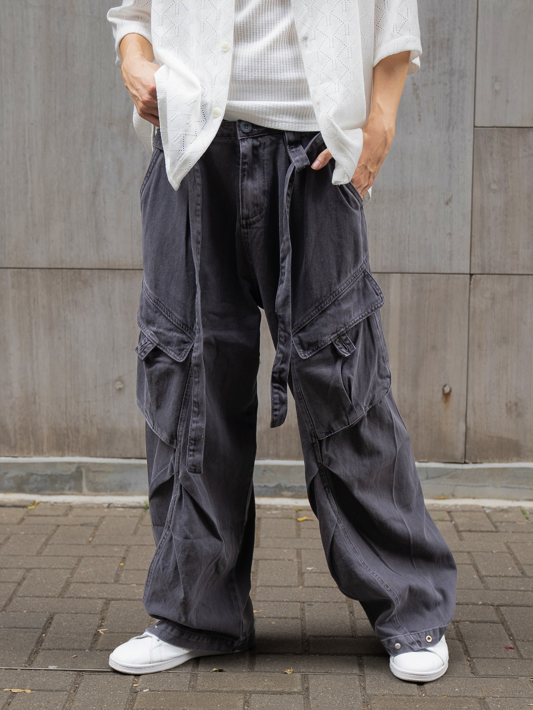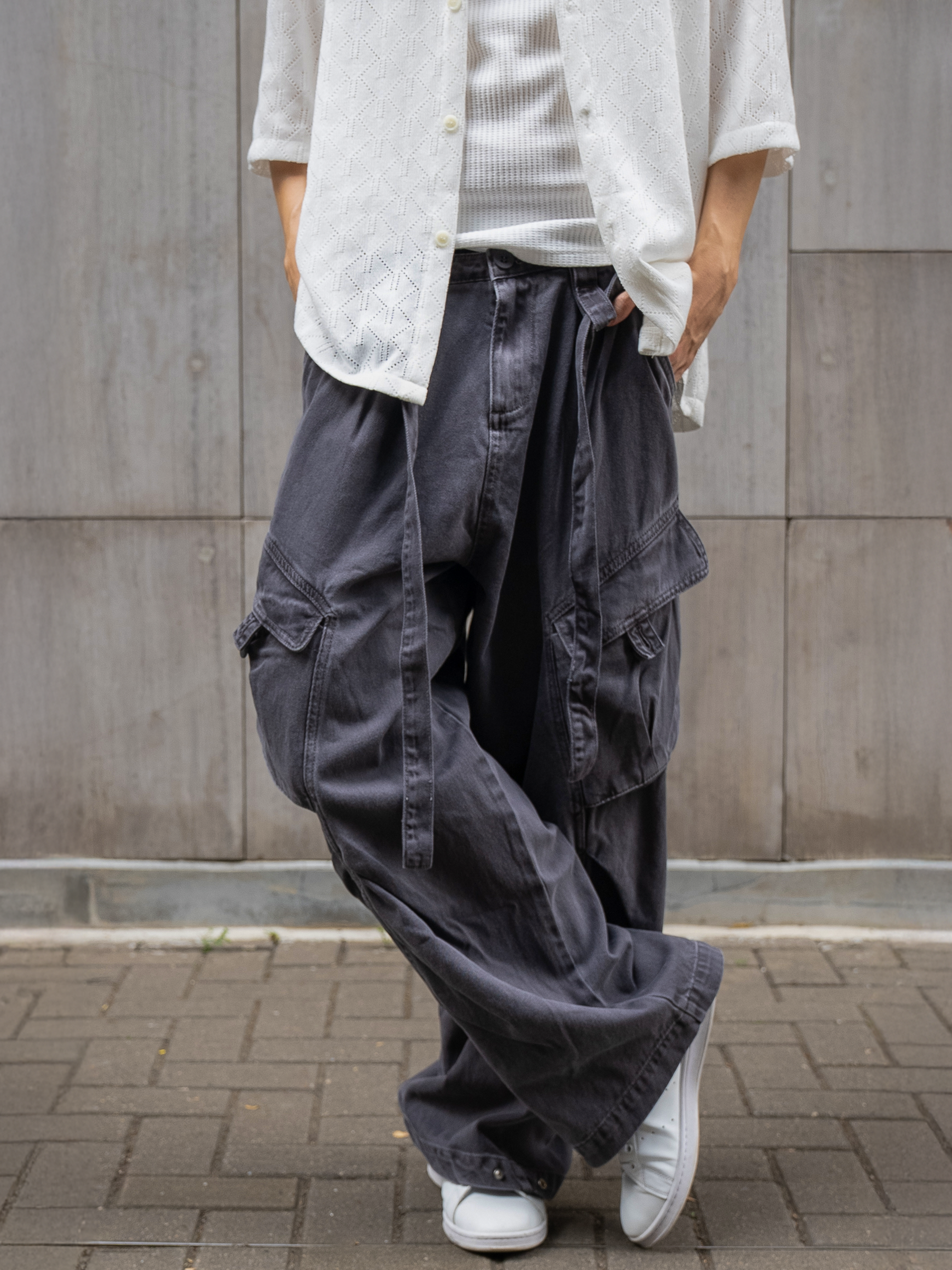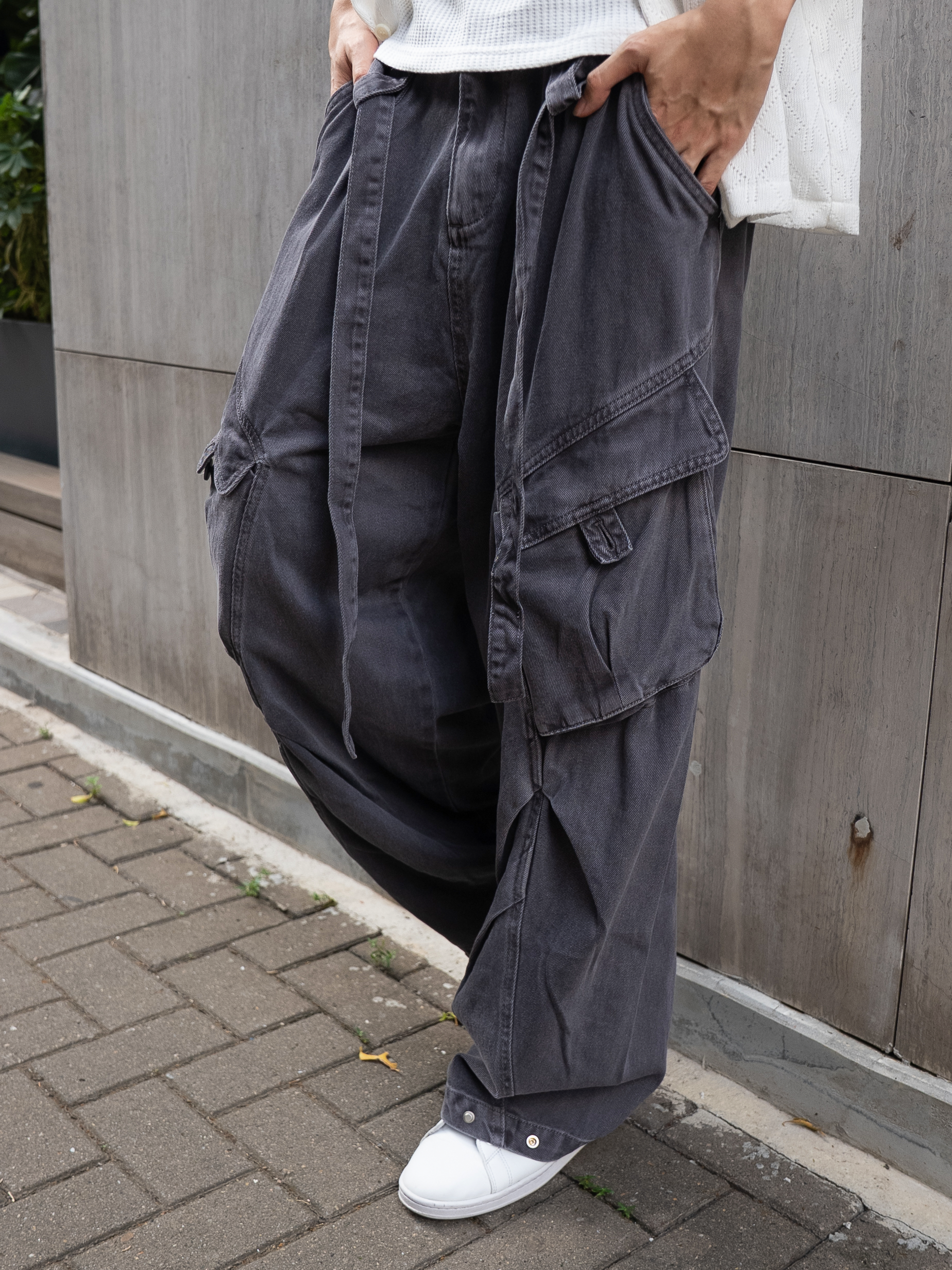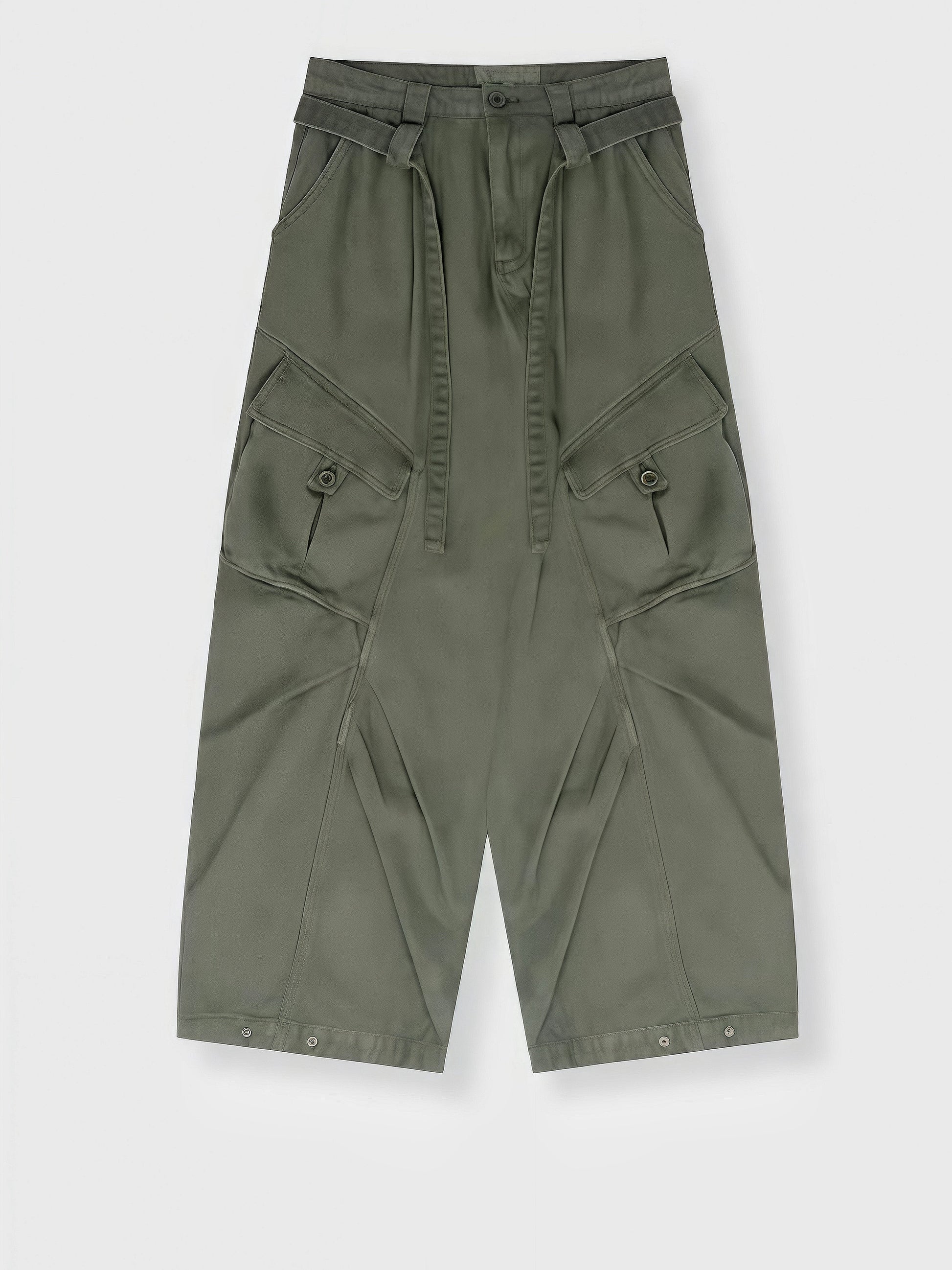 褲身用輕挺布料打造,唔易皺又夠透氣,兩側大口袋加上翻蓋與立體剪裁,細節豐富得嚟唔會太浮誇。附有同布料綁帶,可收腰亦可自然垂落做造型。褲腳自然落地,配波鞋拖鞋都啱。