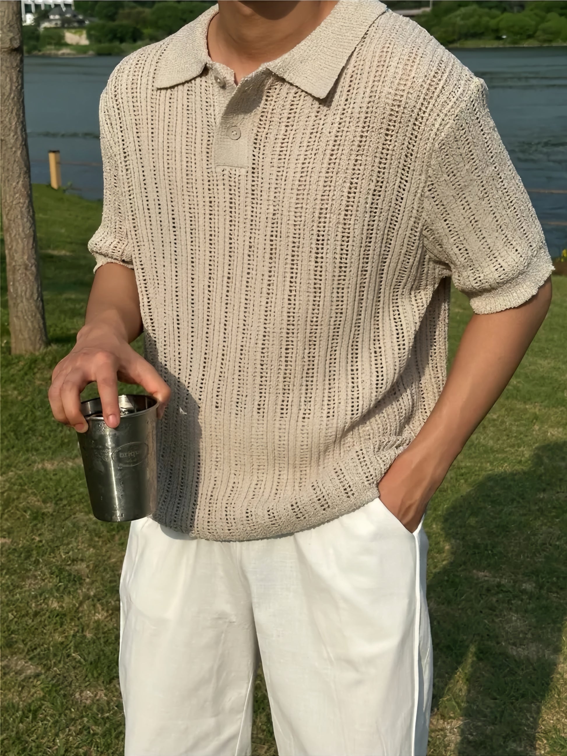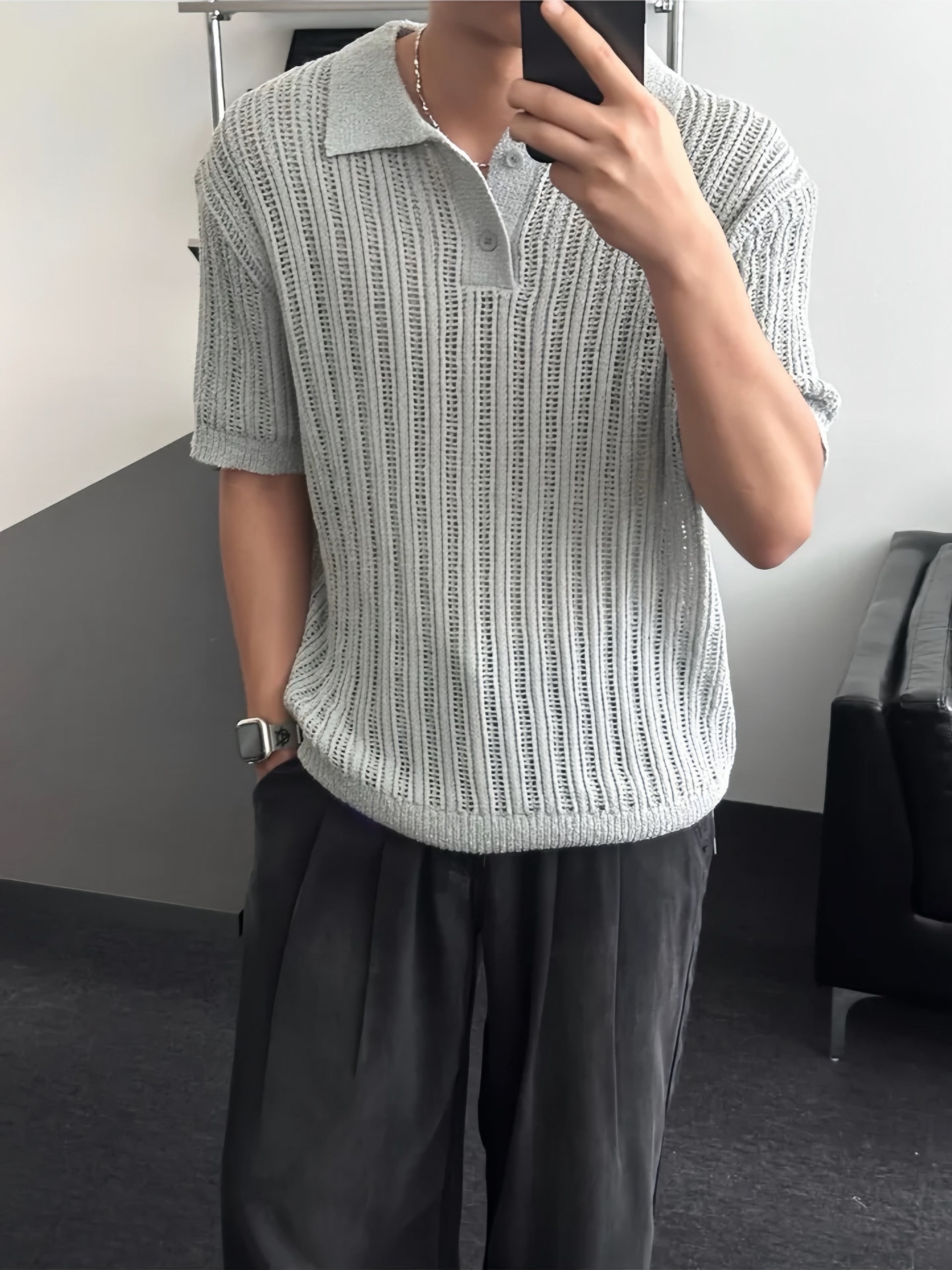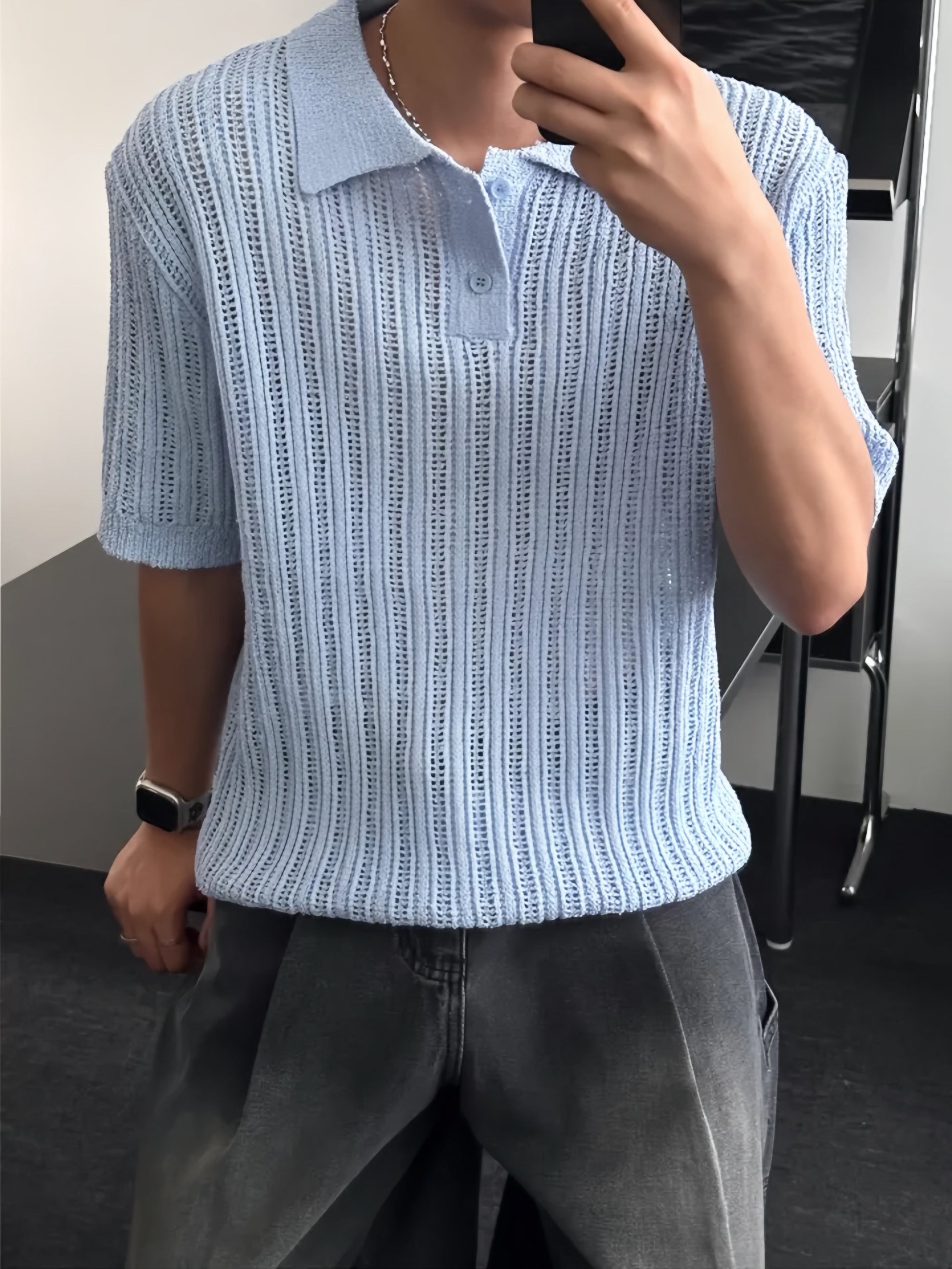 針織面料紋理細緻而有立體感,輕微鬆身剪裁方便活動又唔顯累贅。鏤空設計增加空氣流通,夏天着住都可以保持乾爽。襯亞麻褲或短褲就有慵懶假日感,襯牛仔褲就多咗份韓系斯文味。