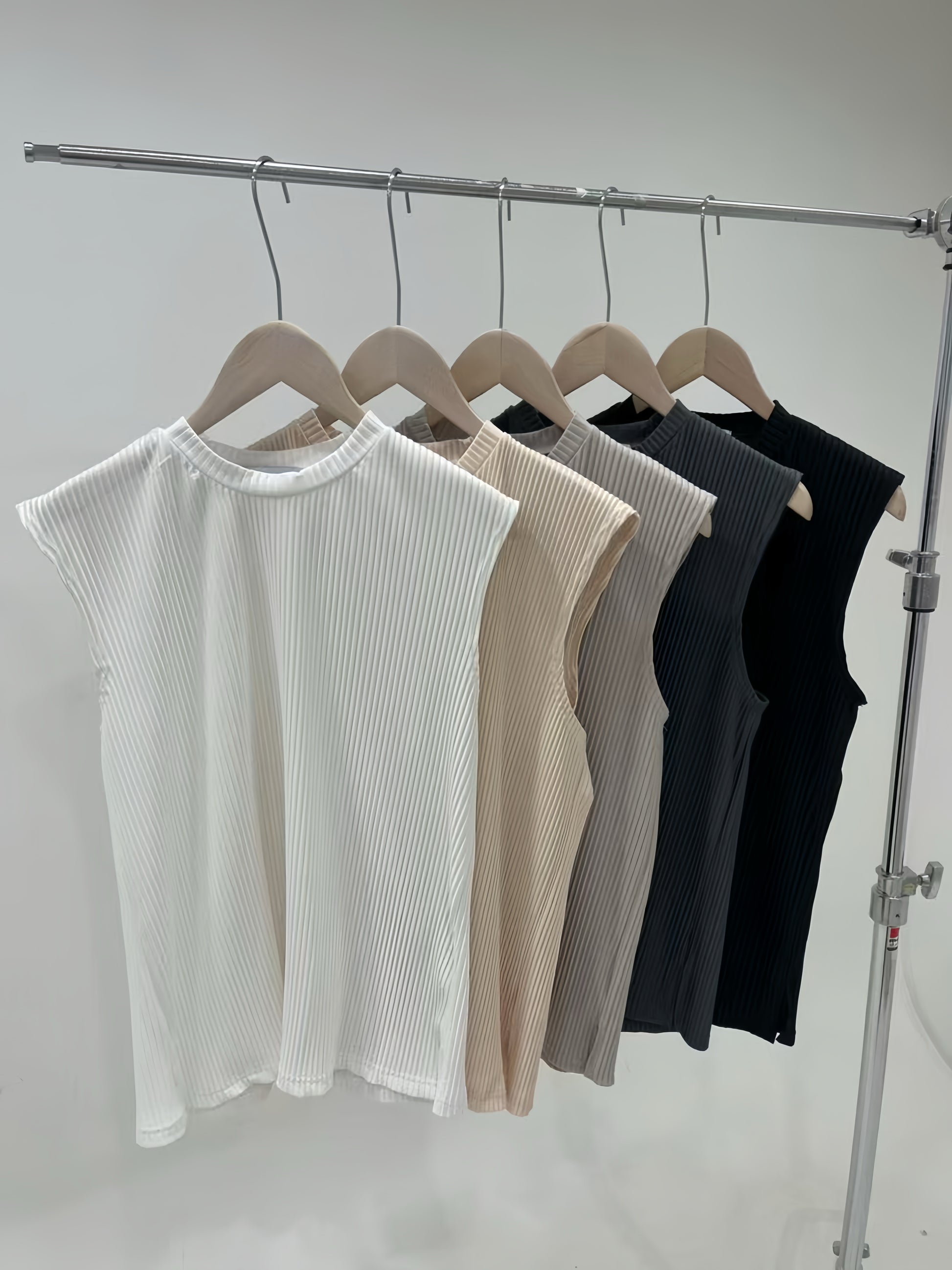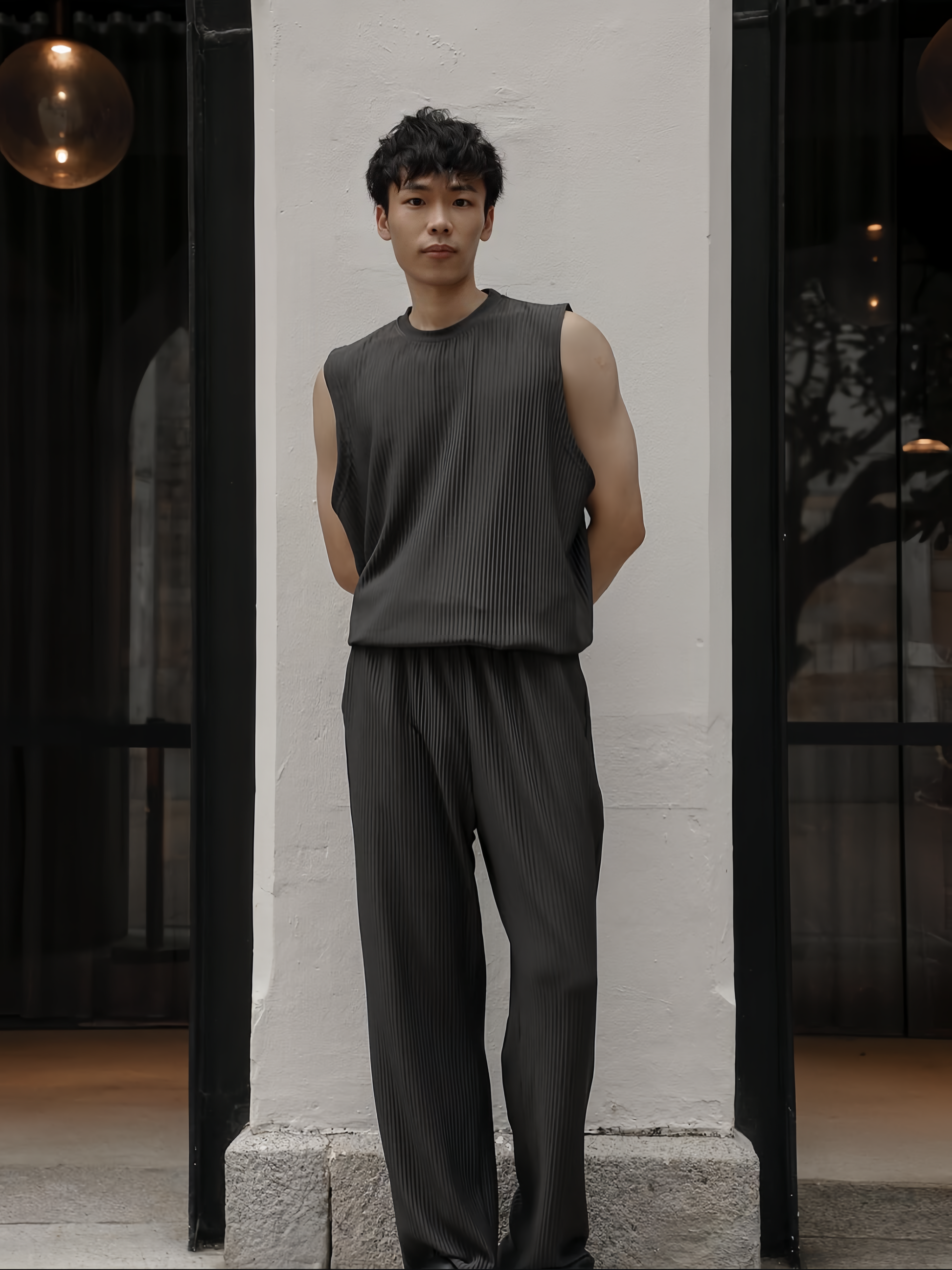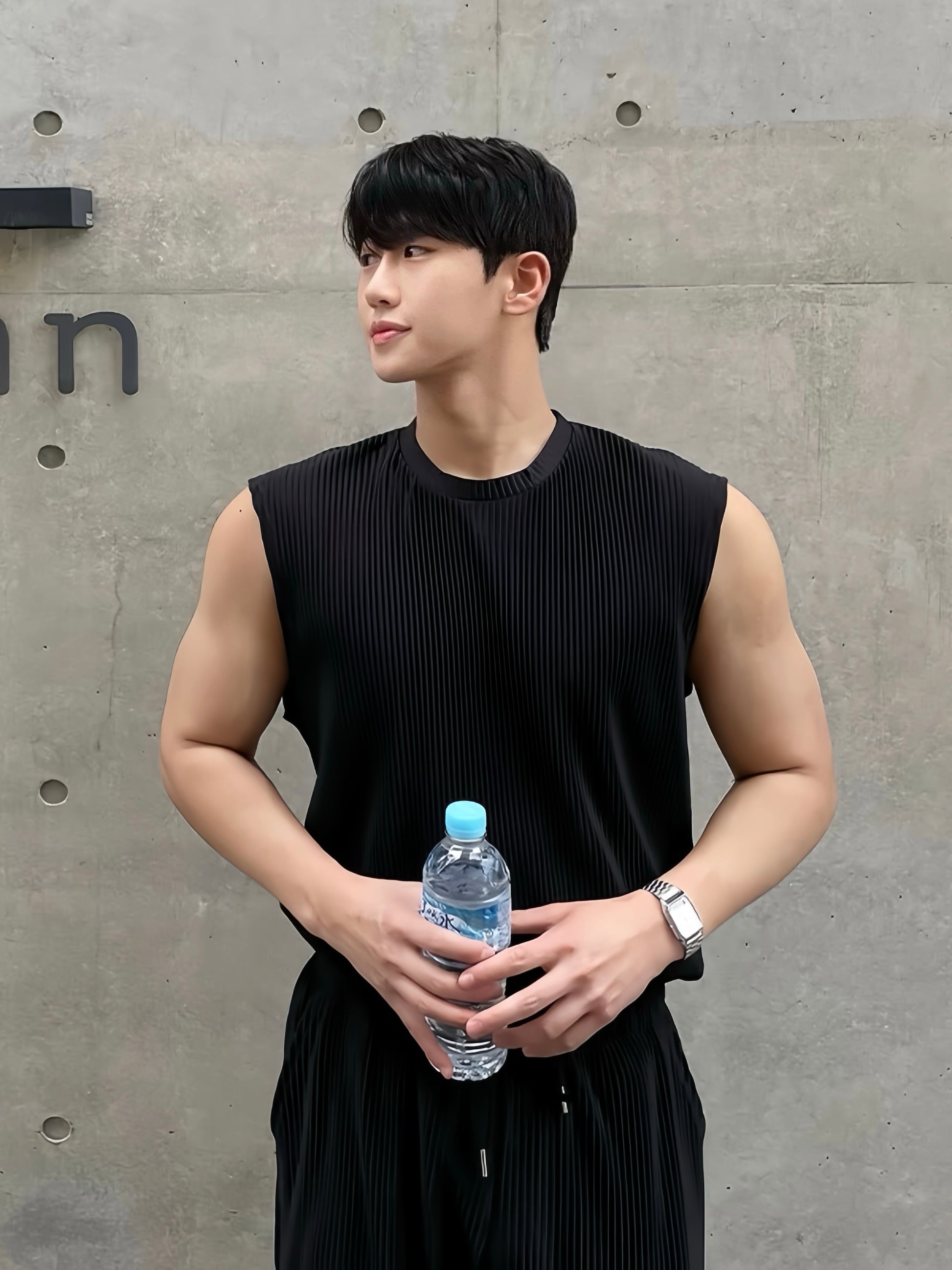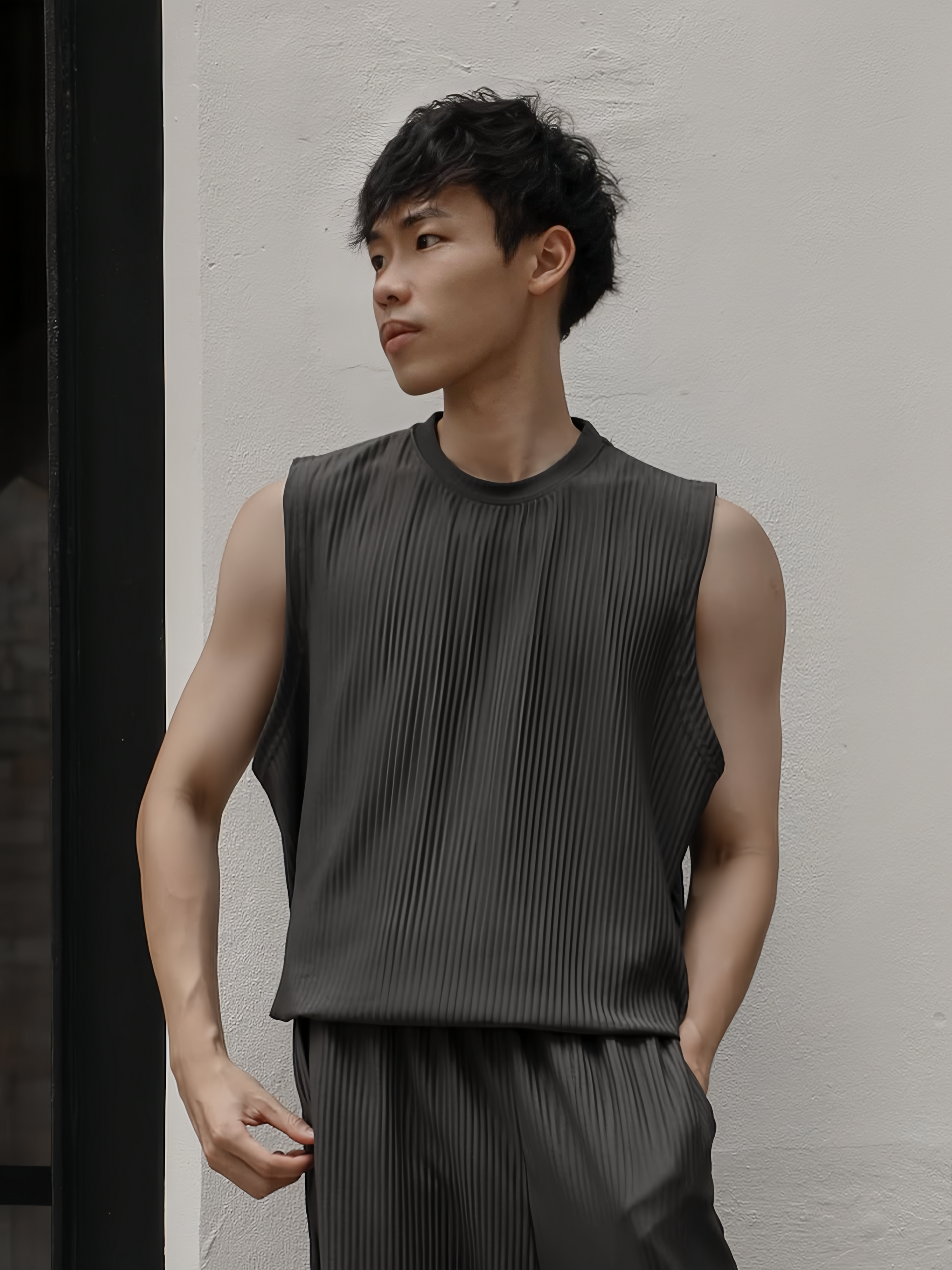 夏天唔一定淨係着Tee,呢件壓褶背心夠輕盈透氣,俐落剪裁令比例更修長。簡單搭條闊褲或者短褲,就有種自然流露嘅韓系街頭感,啱曬去咖啡店、海邊或者旅行着。