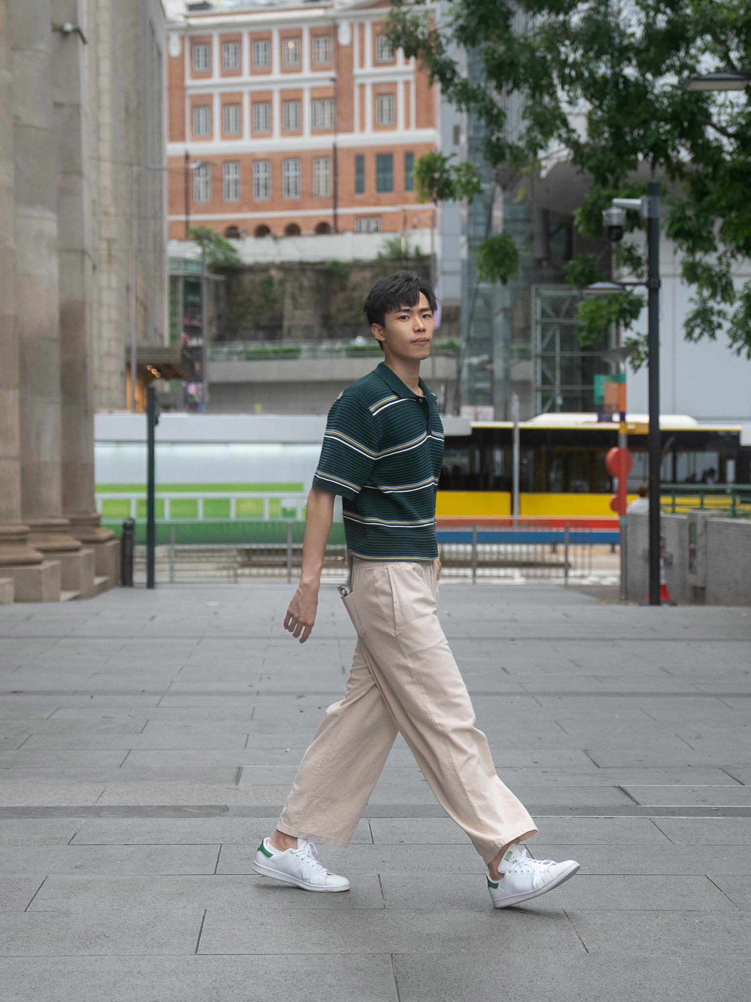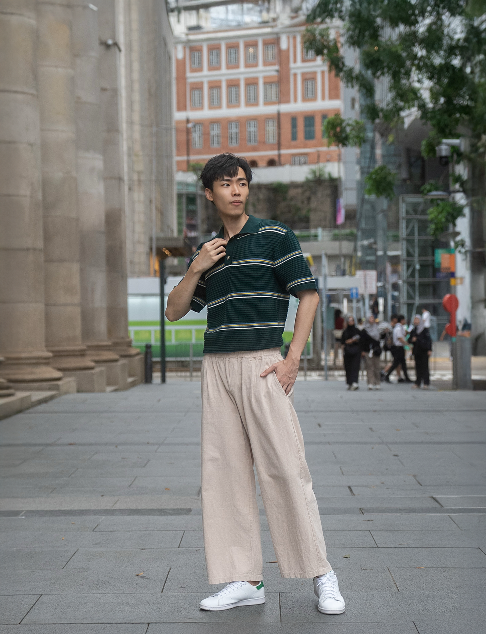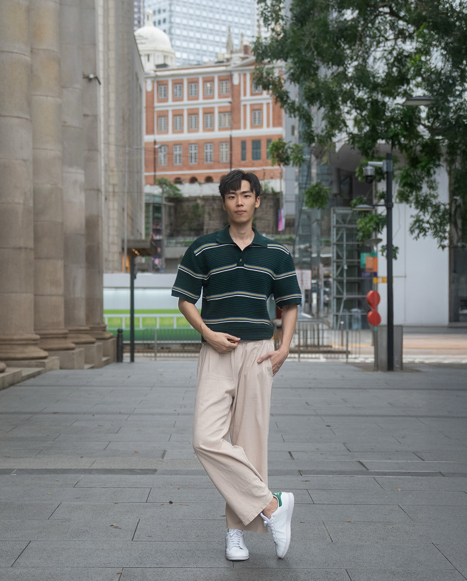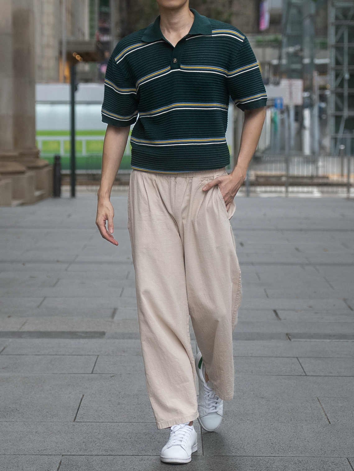 針織上衣版型微鬆,落肩設計加上開領領口,視覺拉闊面形;布料帶少少厚度,唔會貼身,親膚得嚟有立體感。下身長褲用麻棉混紡,質地乾爽透氣,闊腳線條令整體輪廓更乾淨俐落。