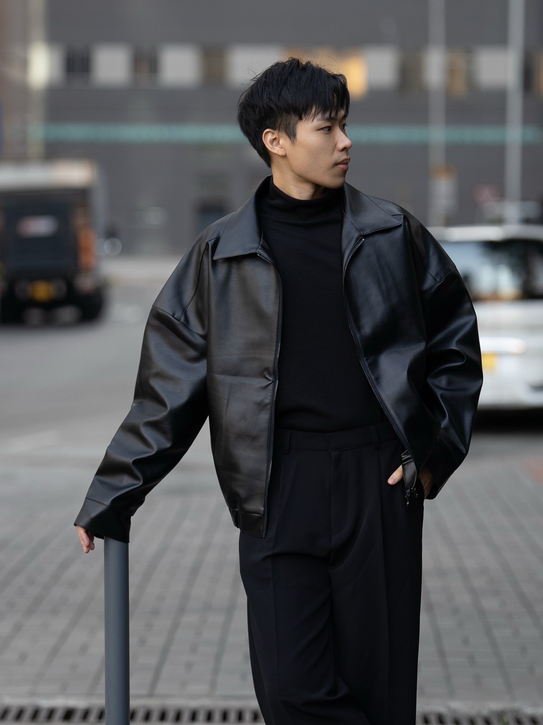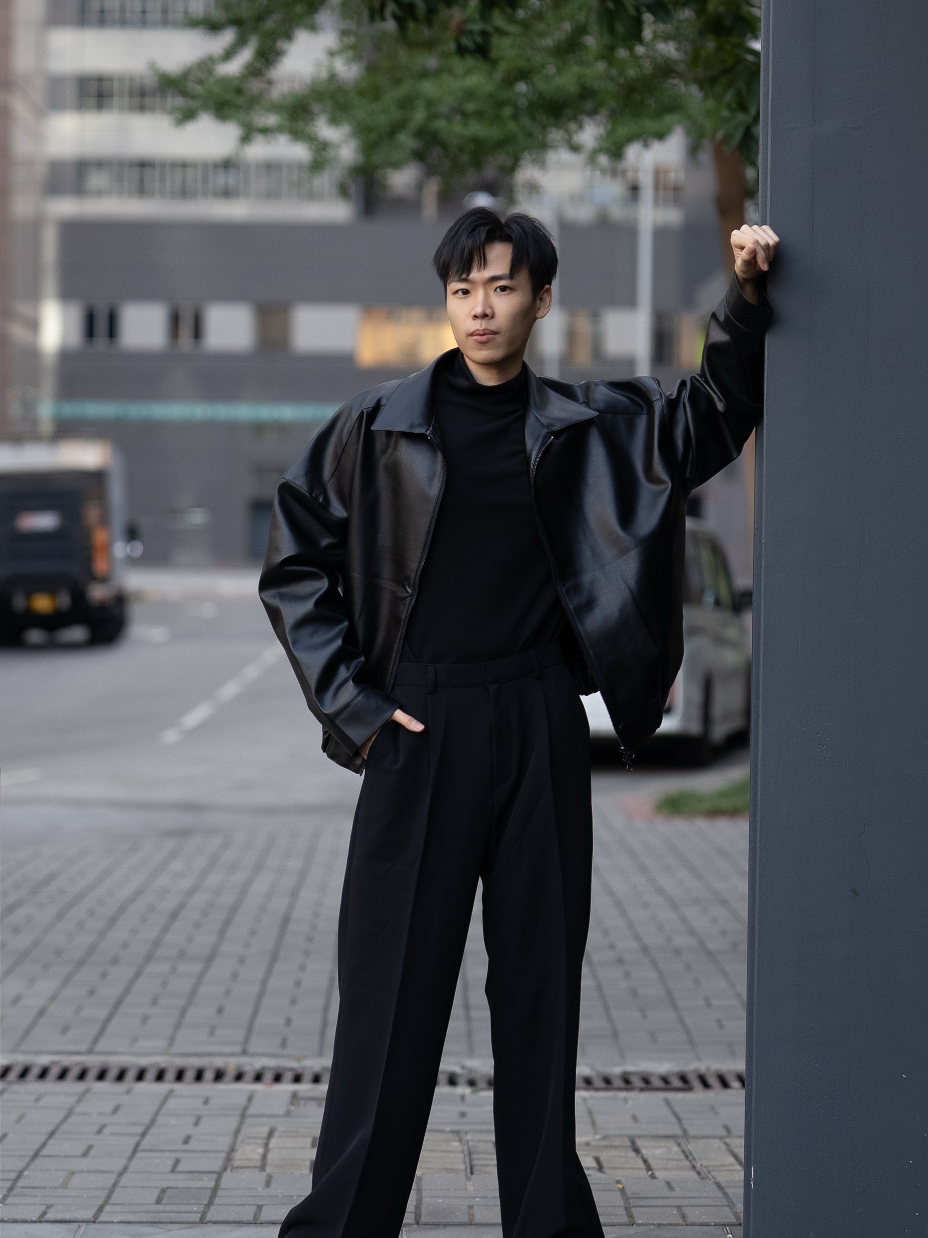 以全黑層次作為主軸,將啞光皮革、半高領針織同寬筒垂墜西褲組合成一套完整造型,唔使再諗點配搭,一着就有氣場。整體線條乾淨俐落,低調但存在感極強,特別適合想要「簡單但有型」嘅日常或夜晚造型。