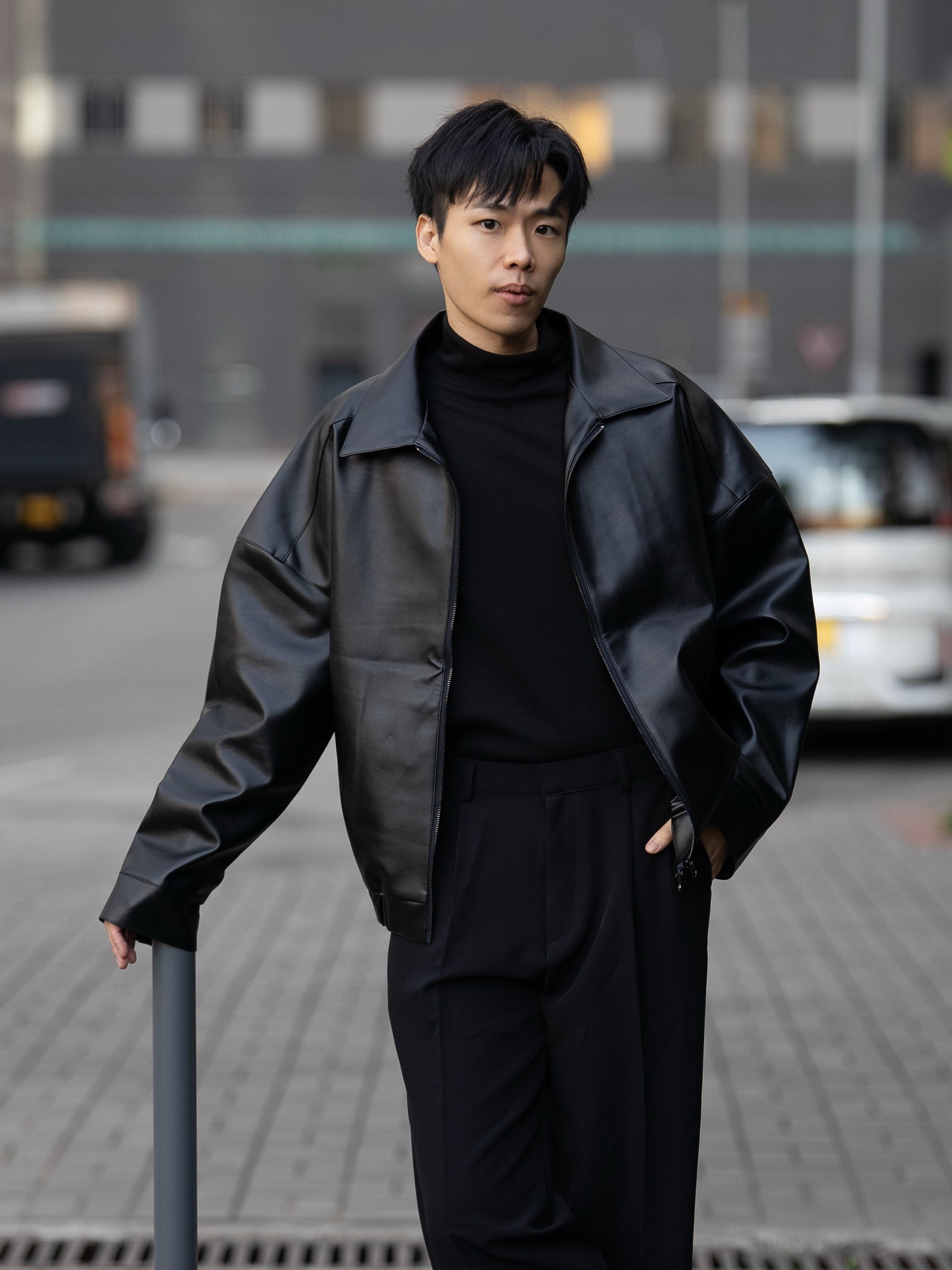 啞光皮革外套帶出冷靜輪廓,半高領上衣平衡層次感,而寬筒西褲則令比例自然拉長,三件一齊着落去,有種首爾街頭常見嘅高冷感覺,斯文得嚟又帶少少距離感。