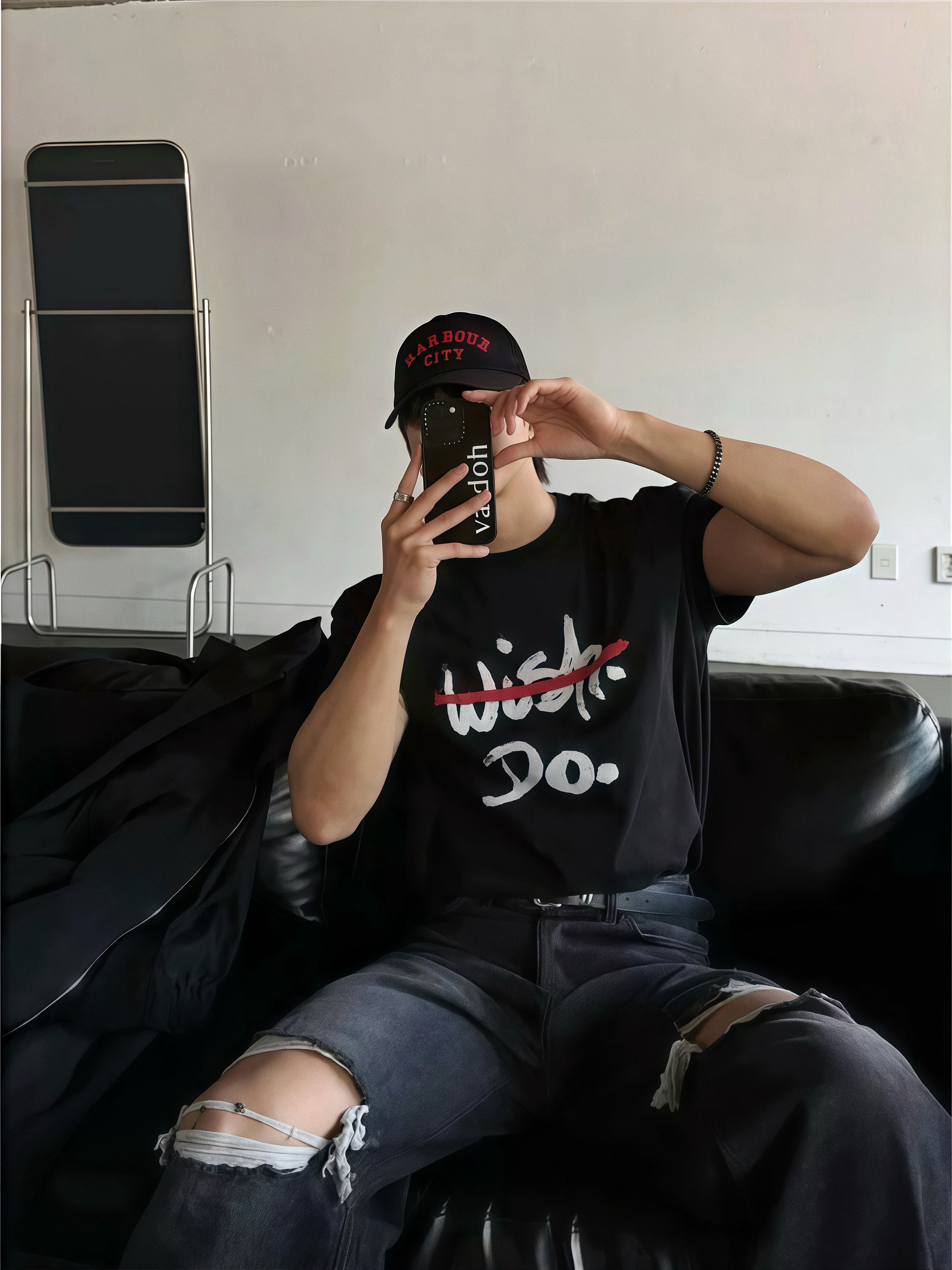 用最簡單嘅筆觸,講最直接嘅訊息。「Wish」被紅線劃走,剩下「Do」,就係你的Style。設計唔浮誇,再配上乾淨白底或夜黑色調,靜靜地展示你的態度